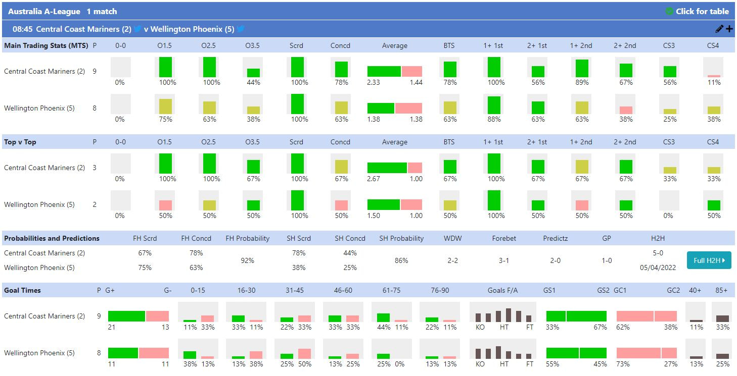 Here's an example of an Australian fixture, showing just 4 rows of information that members had available! The full Team Stats also featured Goal Patterns, League Table Analysis, Goal Value Tables, a pop-up score table and more.