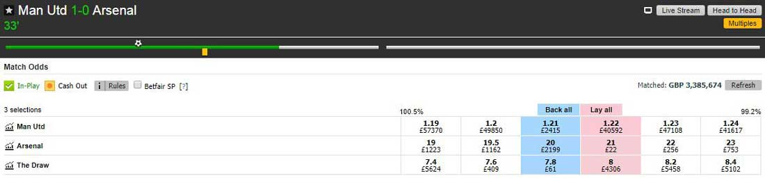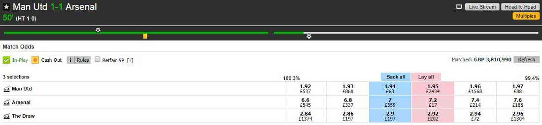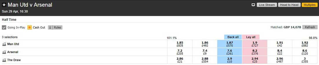 In the Manchester United v Arsenal match you can see it was a lot cheaper to lay the half-time draw and, with the half-time score 1-0, it was a winner too!
