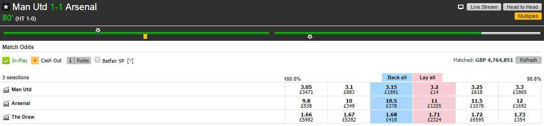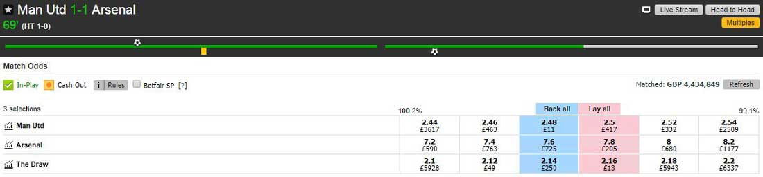 Although Manchester United were attacking constantly, the Arsenal defence was holding firm and you can see below that the draw was odds-on at the betting exchange.